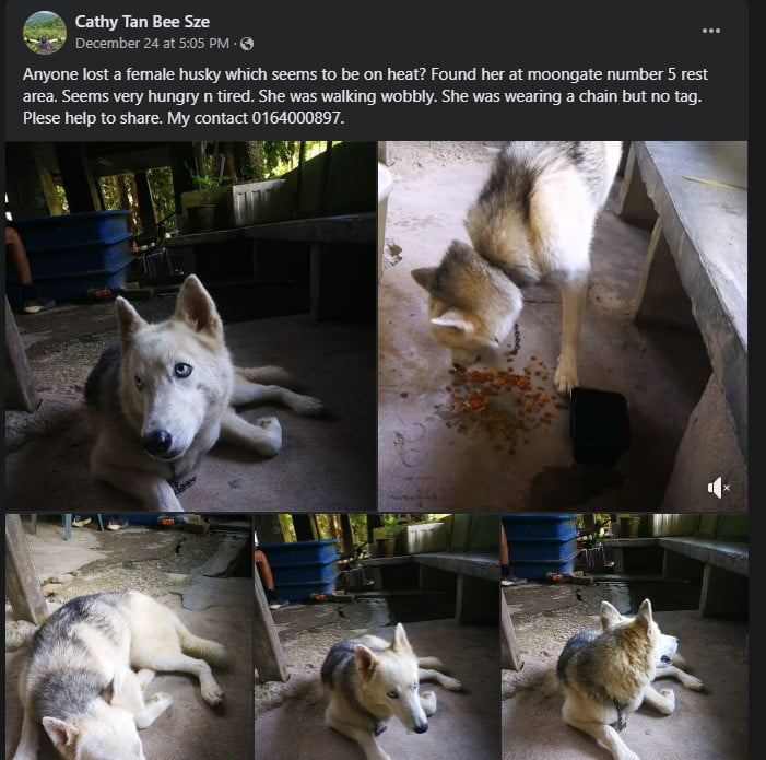 Anyone lost a female husky which seems to be on heat? Found her at moongate number 5 rest area. Seems very hungry n tired. She was walking wobbly. She was wearing a chain but no tag. Plese help to share. My contact 0164000897.