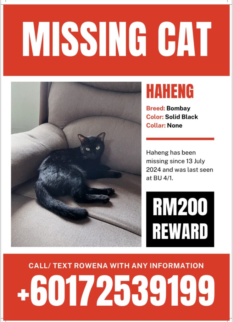 Solid black female cat. Responds to the name Haheng. Neutered. No collar.