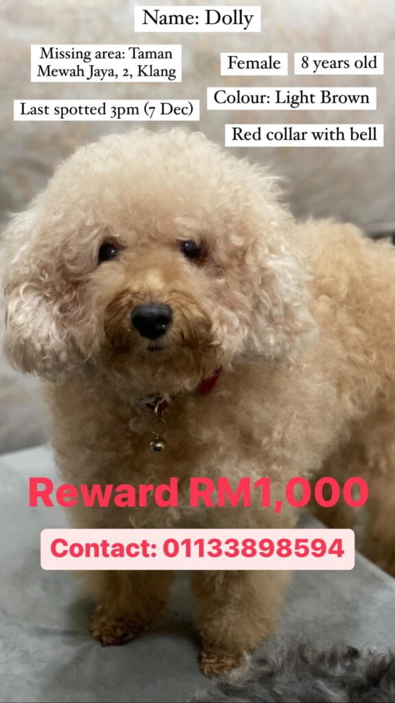 Missing Light brown Poodle with Red Collar with Bell, KlangLostSelangor Bookmark Write a CommentContact InformationTaman Mewah Jaya 2, Klang, 41000 Selangor, MalaysiaLocation Missing DateDecember 7, 2022Detailed InformationHi. My dog went missing. Klang area. She needs medical attention time to time. I beg you please help to find her, definitely rewarding the rescuer!!Nearby Listings within 10 kmSort by: DistanceNewest FirstDog found at Bulatan Aman roundabout (Tmn Sri M...Found DateDecember 15, 2022FoundPersiaran Aman, 40400 Selangor, Malaysia 3.05 kmShih Tzu liked found near Central walk I City, ...Found DateDecember 26, 2022FoundcentralWalk i-City, 40000 Selangor, Malaysia 5.74 km+60162555601Lost Miniature SchnauzerMissing DateMarch 7, 2024LostJalan USJ 4/1L, 47610 Selangor, Malaysia 8.08 km0122961319Dog found at Batu Belah, KlangFound DateDecember 14, 2022FoundNorth Klang Straits Bypass, 41400 Selangor, Malaysia 8.65 km Post navigationPrevious post: Brown poodle found Juru area, PenangNext post: Black dog found at Sophea Residence, Selangor